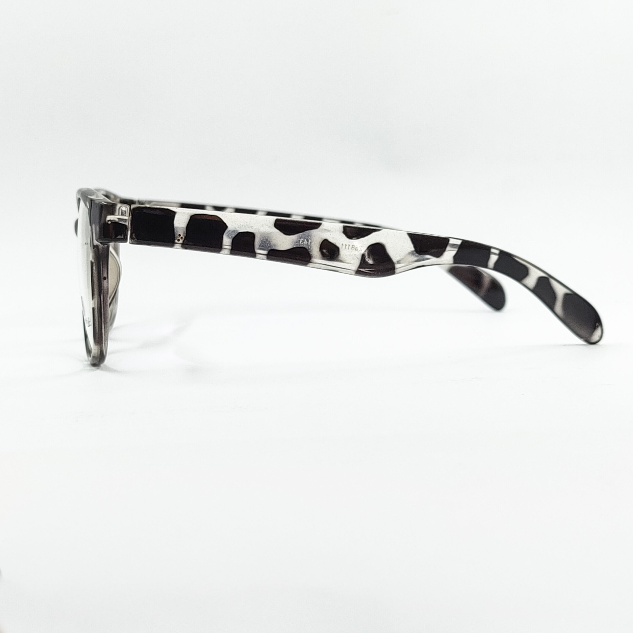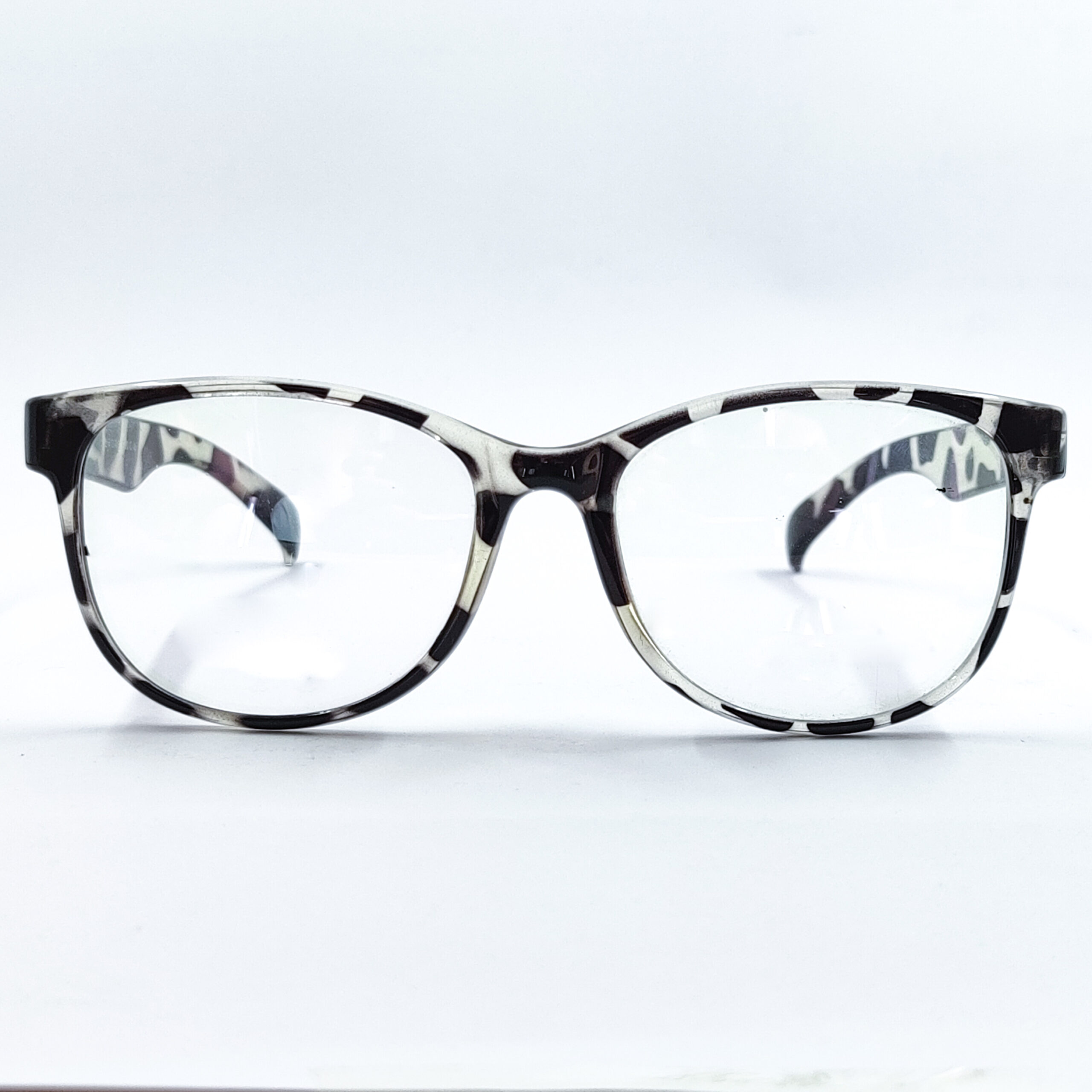 Trendy black and white Snow leopard print round eyeglass frame made from lightweight, durable acetate. Unique design, perfect for prescription, blue-light, or fashion lenses, offering all-day comfort and bold style.